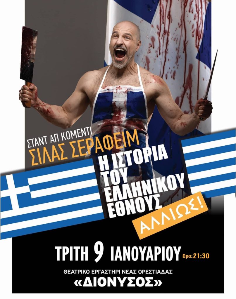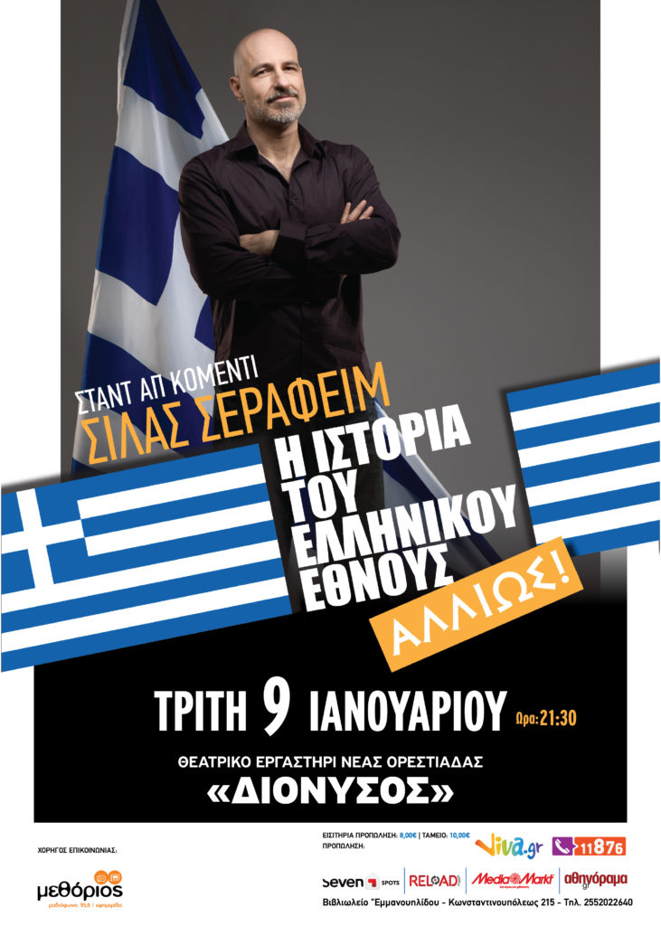 Την Τρίτη 9 Ιανουαρίου 2018 στο Θέατρο Διόνυσος στις 21.30, ο stand-up comedian Σίλας Σεραφείμ, παραδίδει μαθήματα ιστορίας και ανατρέπει όλα όσα νομίζαμε ότι γνωρίζουμε, για την ιστορία του ελληνικού έθνους …
