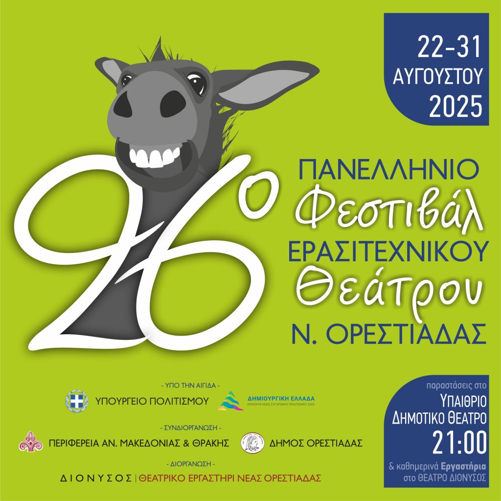 Το 26ο Πανελλήνιο Φεστιβάλ Ερασιτεχνικού Θεάτρου Νέας Ορεστιάδας διοργανώνεται από το Θεατρικό Εργαστήρι Νέας Ορεστιάδας ΔΙΟΝΥΣΟΣ, υπό την αιγίδα και την επιχορήγηση του Υπουργείου Πολιτισμού μέσω του Προγράμματος “Δημιουργική Ελλάδα”, σε συνδιοργάνωση με την Περιφέρεια Αν. Μακεδονίας και Θράκης και τον Δήμο Ορεστιάδας.