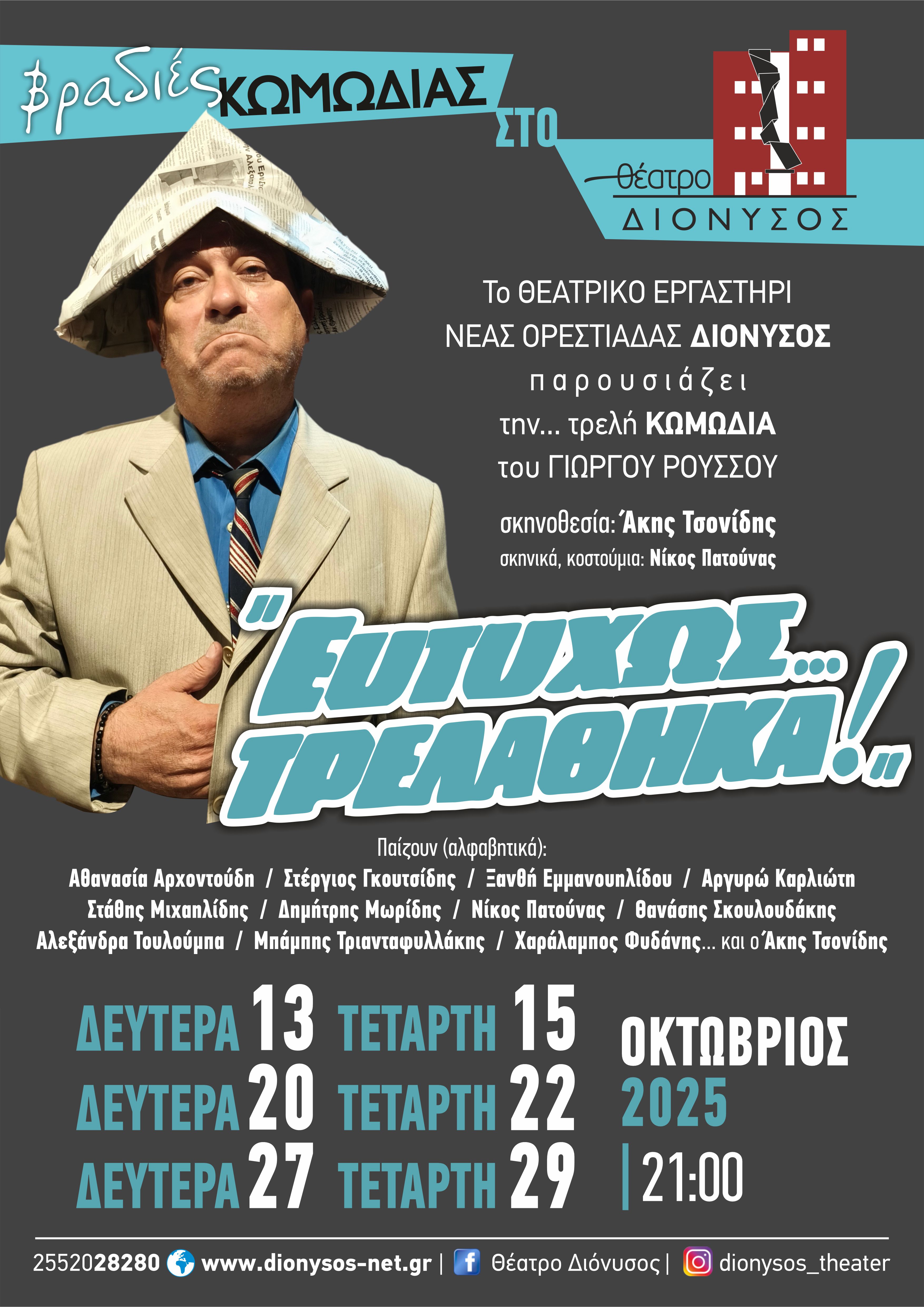 Με νέα διανομή στους μισούς ρόλους επιστρέφει τη Δευτέρα 13/10 η παράσταση «Ευτυχώς Τρελάθηκα» του Γιώργου Ρούσσου από το Θεατρικό Εργαστήρι Νέας Ορεστιάδας ΔΙΟΝΥΣΟΣ, εγκαινιάζοντας τη φετινή χειμερινή σεζόν στο Θέατρο ΔΙΟΝΥΣΟΣ (Ορέστου 76, Ορεστιάδα).