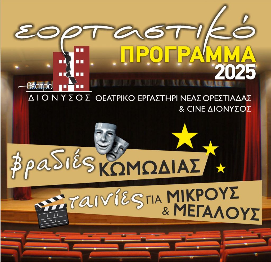 Με θέατρο και κινηματογράφο στη Νέα Ορεστιάδα, το Θέατρο ΔΙΟΝΥΣΟΣ καλεί μικρούς και μεγάλους στο εορταστικό πρόγραμμα που ετοίμασε το Θεατρικό Εργαστήρι Νέας Ορεστιάδας ΔΙΟΝΥΣΟΣ και οι cine-συνεργάτες του. Από την Τετάρτη 10 έως και την Κυριακή 28 Δεκεμβρίου ο ΔΙΟΝΥΣΟΣ συνεχίζει να δίνει τη δυνατότητα για ψυχαγωγία και διασκέδαση και κατά τη διάρκεια της εορταστικής περιόδου όπως κάθε χρόνο∙ πλέον στον ανανεωμένο χώρο του, καθώς μετά από παρεμβάσεις στην πλατεία οι σειρές των καθισμάτων έχουν αραιώσει, προσφέροντας στους θεατές ακόμη περισσότερη άνεση και ευρυχωρία.