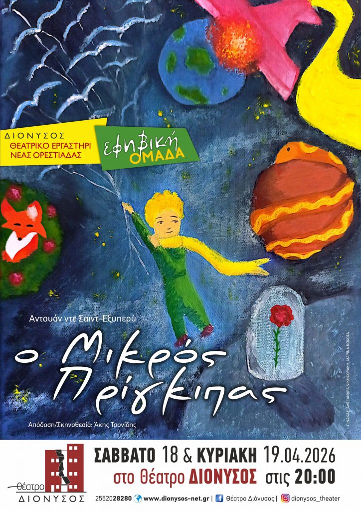 Η Εφηβική Ομάδα του Θεατρικού Εργαστηρίου Νέας Ορεστιάδας ΔΙΟΝΥΣΟΣ ενέκυψε φέτος πάνω στον παγκόσμιο «ύμνο» της παιδικής αθωότητας και έπειτα από πρόβες, συζητήσεις, αναλύσεις, σκέψεις, συνθέσεις, αντιθέσεις, ανακαλύψεις και αποκαλύψεις, παρουσιάζει την παράσταση του έργου «Ο Μικρός Πρίγκιπας«. Θεατρική απόδοση από το συμβολικό παραμύθι του Αντουάν Ντε Σαιντ Εξυπερί που κυκλοφόρησε το 1943 μέσα στη δίνη του πολέμου, ως μια πράξη αντίστασης με φτερά την αγάπη, τη φιλία και την ηθική, εκφράζοντας ένα βαθιά αντιπολεμικό μήνυμα. Πολλές δεκαετίες μετά, παραμένει η ζωντανή υπενθύμιση πως… «την ουσία δεν τη βλέπουνε τα μάτια∙ με την καρδιά βλέπεις πάντα καλύτερα».